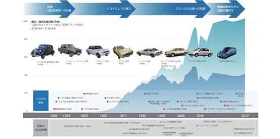 日常生活中,許多產品都出自百年企業。以豐田汽車為例,起源是豐田佐吉1890年發明了自動織布機,並取得專利;1894年成立豐田商店,銷售自己發明的商品,使用織布機的紡織業搭上一次世界大戰的景氣順風車,員工增加到1000人;1918年創設豐田紡織公司。