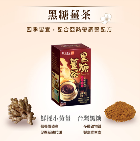 1.黑糖薑茶-四季皆宜:配合亞熱帶調整配方,並針對東方人飲茶習慣加入台灣在地食材;鮮採小黃薑有著極高營養價值並促進新陳代謝、台灣黑糖擁有多種礦物質與豐富維生素,口感微辣中帶甜,令人愛不釋手!