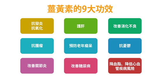 研究發現薑黃素能降低空腹血糖值、糖化血色素和身體質量指數(BMI),還可以改善胰島素阻抗,並經由多種分子途徑調節及改善糖尿病及周邊神經病變、腎病變、血管疾病等併發症。