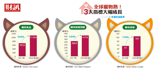 根據研調機構Modor Intelligence估計,2017年全球寵物食品市場規模已來到787億美元,並將持續以年複合成長率5.03%成長。另一研調機構歐睿國際(Euromonitor International)更預測,2024年全球寵物食品的產值幾乎可媲美巧克力糖果市場的規模,高達1150億美元。而這僅僅是寵物商機中的一環,另外還有寵物醫療照護、保險等需求,在眾多國際研調機構的眼裡,未來幾年都是呈現明確向上的趨勢。有趣的是,日本早在2016年就因為生育率下降、步入高齡化社會,更將消費者物價指數大做調整,除剔除兒童午餐項目,取而代之的是助聽器、護膝用品納入外,更首度把貓砂、狗狗的如廁用品,納入物價指數中。