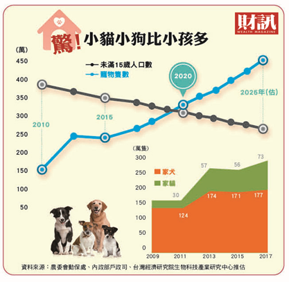 根據美國寵物用品協會調查,全球寵物市場市占最大的美國,有67%的家庭至少擁有1隻寵物。全美3.27億的人口,總計飼養了1.84億隻犬貓,也就是3個人中就有1人擁有1隻寵物。在台灣,走在人行街道上,迎面而來的嬰兒推車裡,窩著貓狗的機率,可能比躺著酣睡的嬰兒還要高。根據農委會兩年1次的最新調查數據,2017年全台的寵物隻數超過251萬隻,而行政院2018年底統計15歲以下幼年人口約300萬人;台灣經濟研究院生物科技產業研究中心預估,今年毛小孩將以300萬隻的數量,正式超越台灣幼年人口。