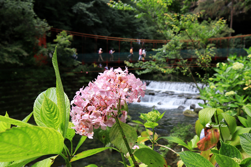 松瀧岩的繡球花分佈在溪邊二側,大約花了五成,滿開時一定能將壯麗的山景點亮。