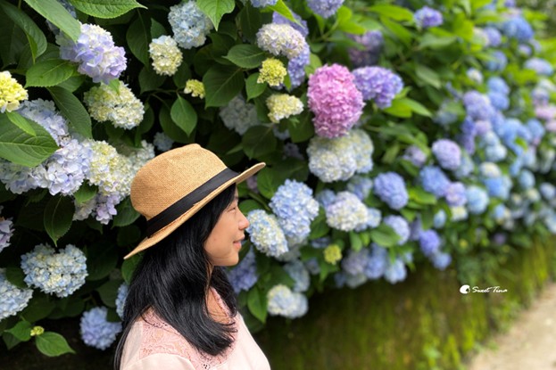 這個視野是我最喜歡的拍攝角度,不僅能拍出繡球花的美,還能將山景一併收錄,最棒的是還有浪漫的風車陪襯著,有種異國風情的美。
