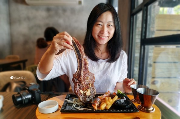 看我拿在手上就知這隻戰斧牛排有多霸氣了,都比我的臉還大了XD,骨頭旁的肉肉也別放過啊,最後都不顧形象的拿起來啃了,哈哈!