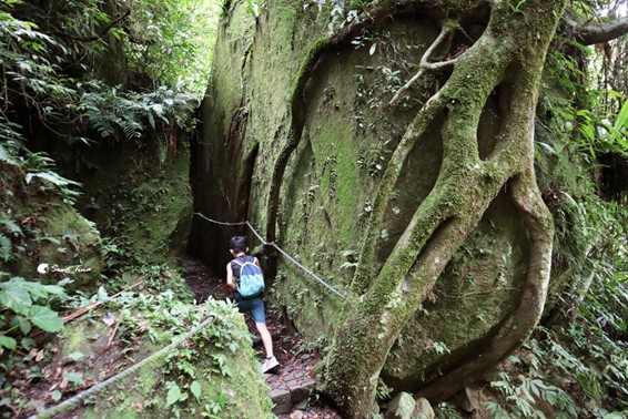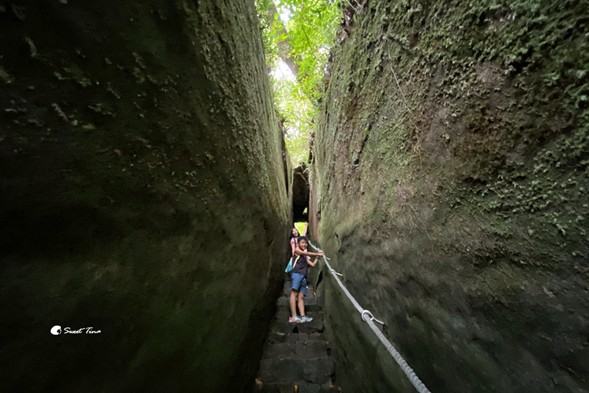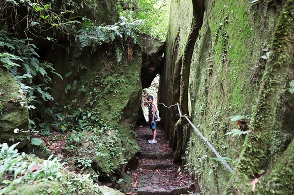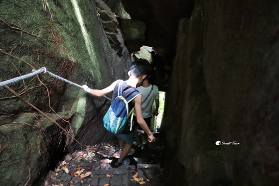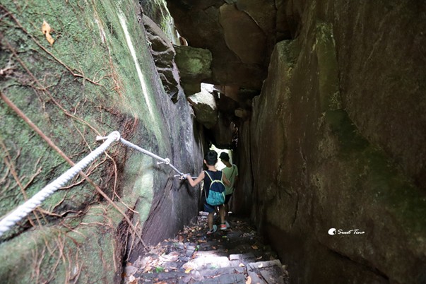 巨石間只能一人通行,而且光線較為暗,建議要拉著一旁的繩索步行較為安全。