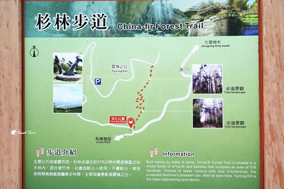 雲嶺之丘及五元兩角皆有停車場,旅人可依自身體力狀況規畫路線,這次我們健行賞景路線為 : 五元兩角->杉林步道->雲嶺之丘