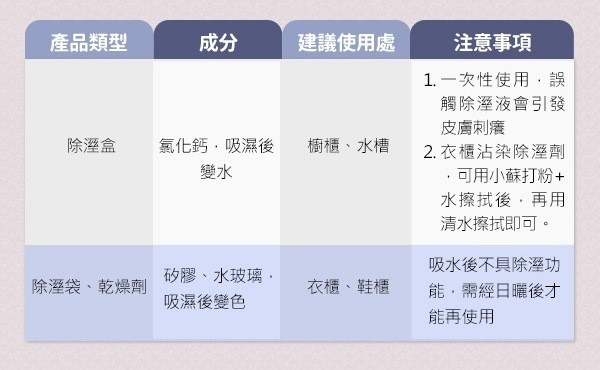 市面上較常見的有除濕包、除濕盒及除濕袋,內容物成分大不相同,除了依照包裝說明上使用之外,認識除濕成分可以幫助你選購到更適合除濕防霉的產品喔!