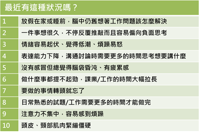 腦疲勞常在不知不覺中發生,尤其是工作/課業上習慣不休息也要做到最好、容易執著在一個點上鑽牛角尖的人。認真盡力唸書做事是一種負責任的表現、也值得加分讚賞,但把腦袋瓜逼太緊過度消耗,反而不利於長久的健康,以下的情況如果已經中了5項以上,請用拚搏的精神也努力讓大腦休息放鬆一下吧。