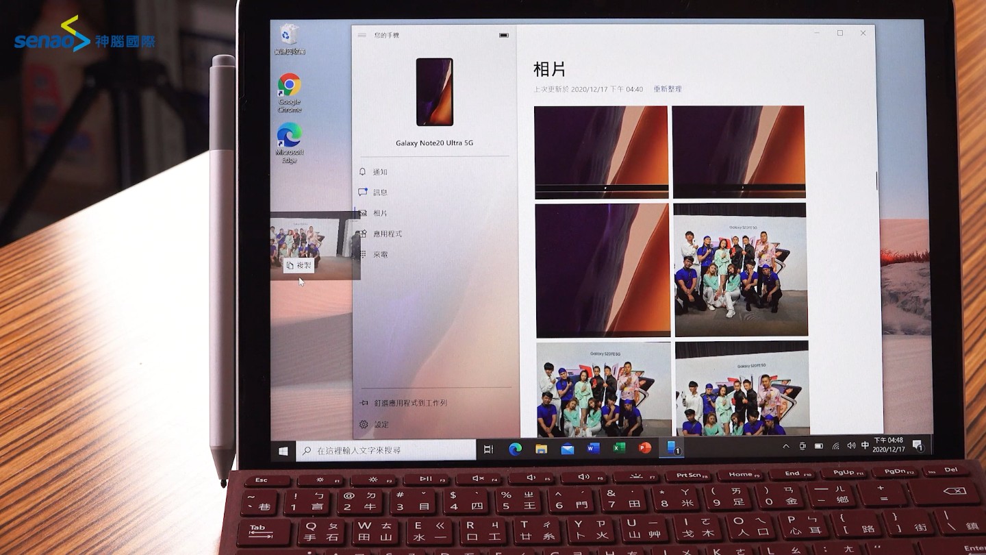Galaxy 手機與 Windows 電腦連結上以後可以做什麼?其中一項功能就是「傳輸照片」,只要在 Windows 電腦上的「您的手機」app 中點選「相片」,就可以看到 Galaxy 手機中所拍攝的照片,只要「按住」照片並拖拉到 Windows 電腦的桌面,就能將照片直接傳輸到電腦,十分方便,不用傳輸線也不需要先上傳到 Google Drive 的雲端空間。