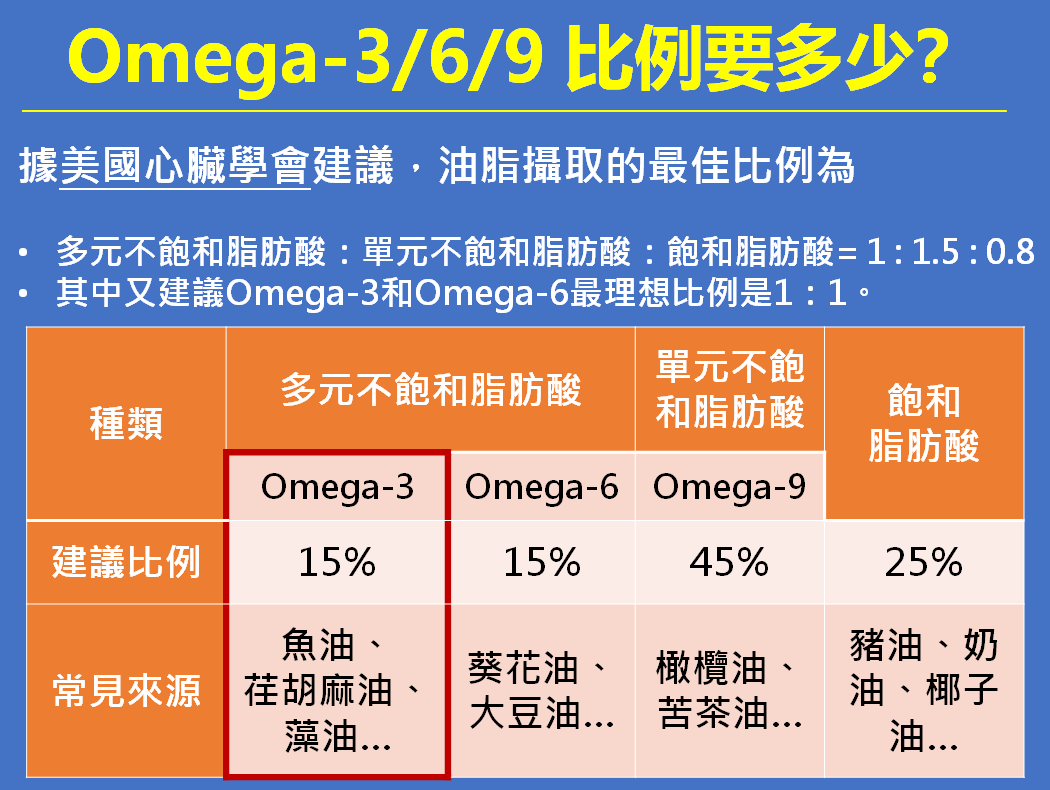 Omega-3也就是多元不飽和脂肪酸,包含有DHA、EPA、ALA三種,因為無法由人體自行合成,只能從外在攝取,而魚類 (特別是深海魚) 的油脂中含有DHA與EPA兩種,依據日本厚生勞動省與美國心臟協會建議,一般成人最好每日應攝取1千毫克左右的DHA及EPA,有助於預防血管中的血栓形成、降低心血管疾病的風險,DHA對胎兒腦部發育也有重要的影響,惟須注意,多食容易有噁心、暈眩等反效果。
