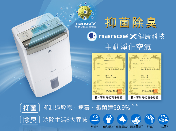 Panasonic 還有 nanoeX 健康清淨技術,能夠「抑菌除臭」,抑菌部分可抑制「過敏原、病毒及黴菌達 99.9%」,除臭部分則可以消除「菸味、室內曬衣、寵物異味、烤肉異味、汗臭及垃圾」六大生活異味