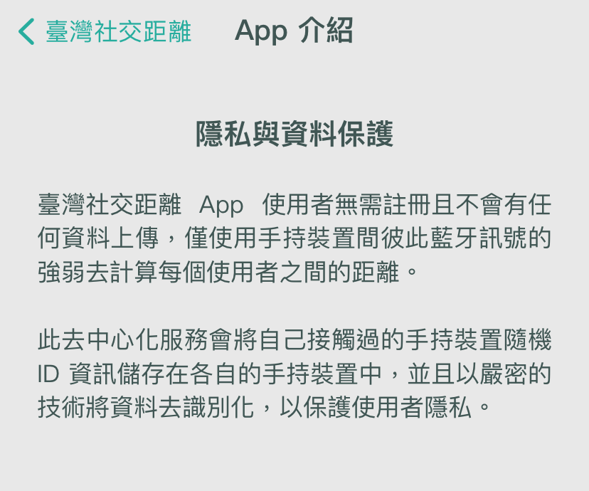 如果有下載「臺灣社交距離」app 的使用者確診,可以發布已經去識別化的手機隨機 ID,曾與確診者近距離接觸過一段時間(2公尺內接觸2分鐘以上)的人,就會收到通知,但無法知道是誰,所以個人隱私不會被揭露。