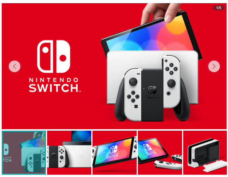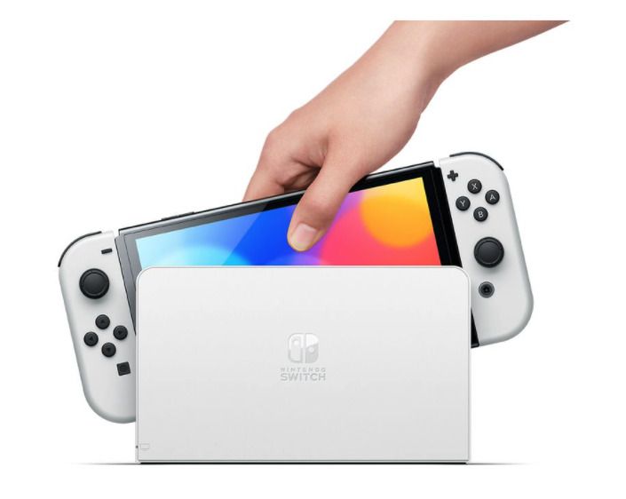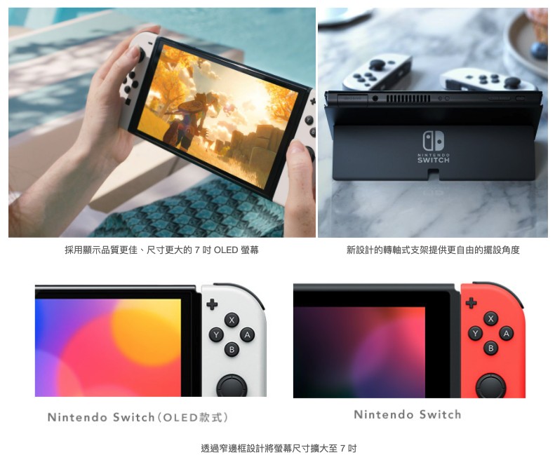 這款新型 Nintendo Switch 主機最大的變更點在於採用了全新的 OLED 螢幕,提供更鮮豔的色彩,並透過窄邊框設計將尺寸擴大至 7 吋 ※1,解析度維持 720p 不變。新設計的轉軸式支架提供更自由的擺設角度。全新設計的喇叭提供更佳的音效表現。內建儲存空間擴大為 64GB ※2。底座則是新增內建有線網路連接端子。