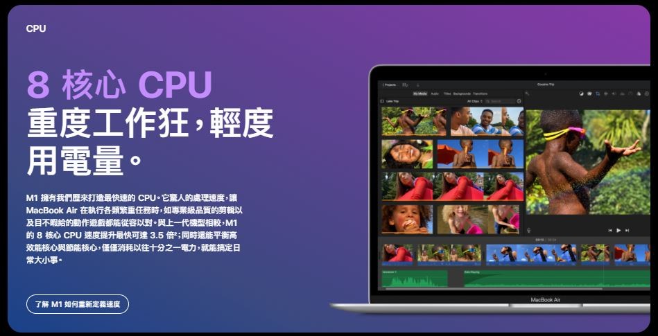 蘋果更強調最新M1晶片相較上一代處理器,可提供最快達3.5倍的CPU效能以及最快可達5倍的GPU效能,同時還能平衡高效能核心與節能核心,在電量消耗上只需以往十分之一電力,電池續航力較以往的Mac高出2倍,續航力達到18個小時以上。