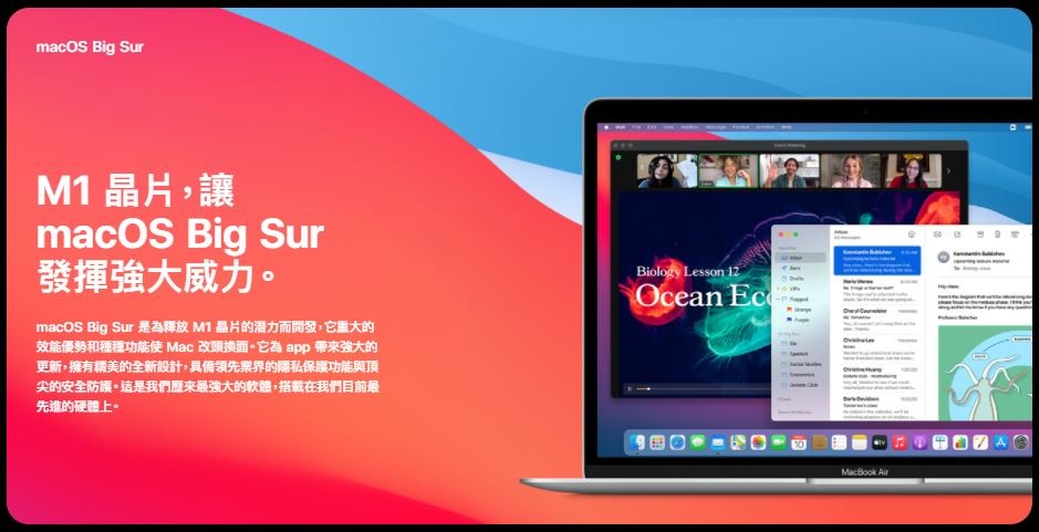 除此之外,專為M1晶片所設計的macOS Big Sur作業系統,完全釋放M1 晶片的強大之處,不論是在效能、電池續航力,甚至是安全防護等相關功能上都有大幅度提升且更符合使用者需求,像是JavaScript的執行速度提升 1.5 倍,反應速度提升將近 2 倍等等。