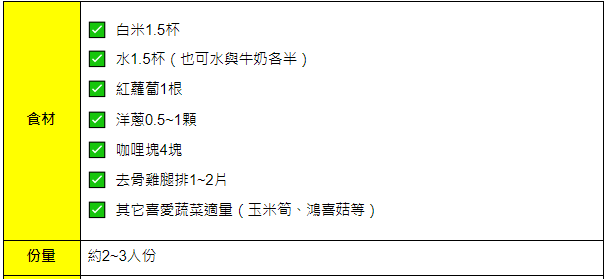 STEP 3.—待雞肉塊醃漬完成後,將白米、水、蔬菜、雞肉塊,以及剩下的2塊咖哩塊依序放入電子鍋,按下炊煮鍵。