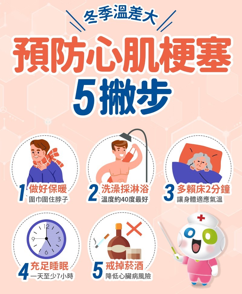 5.根據衛福部統計,抽菸比不抽煙者罹患心肌梗塞機率高2-7倍,喝酒會造成血管擴張,接觸冷空氣後又導致血管收縮,如此一來會增加心肌梗塞風險,建議是戒除菸酒較好。