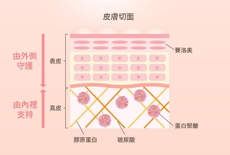 綜上所述,我們換個方式來說,如果皮膚是一面牆,那蛋白聚醣就如同鋼筋一樣的存在,支撐著牆面的主要結構,而膠原蛋白就是水泥,除了也一樣有支撐的作用,還讓牆面看起來平整不凹凸,神經醯胺(賽洛美)則如同牆面的磁磚,除了讓牆面看起來光滑細緻,還同時起到保護鋼筋水泥,使其不要裸露在風吹雨打日曬雨淋的侵蝕下,所以想要讓牆面看起來平整美觀像新的一樣,除了要有足夠的水泥(膠原蛋白),其他元素也是缺一不可的呦~