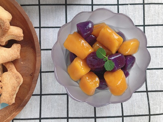 (紫色地瓜的汁液會染色,所以最好要跟黃地瓜分開容器)
