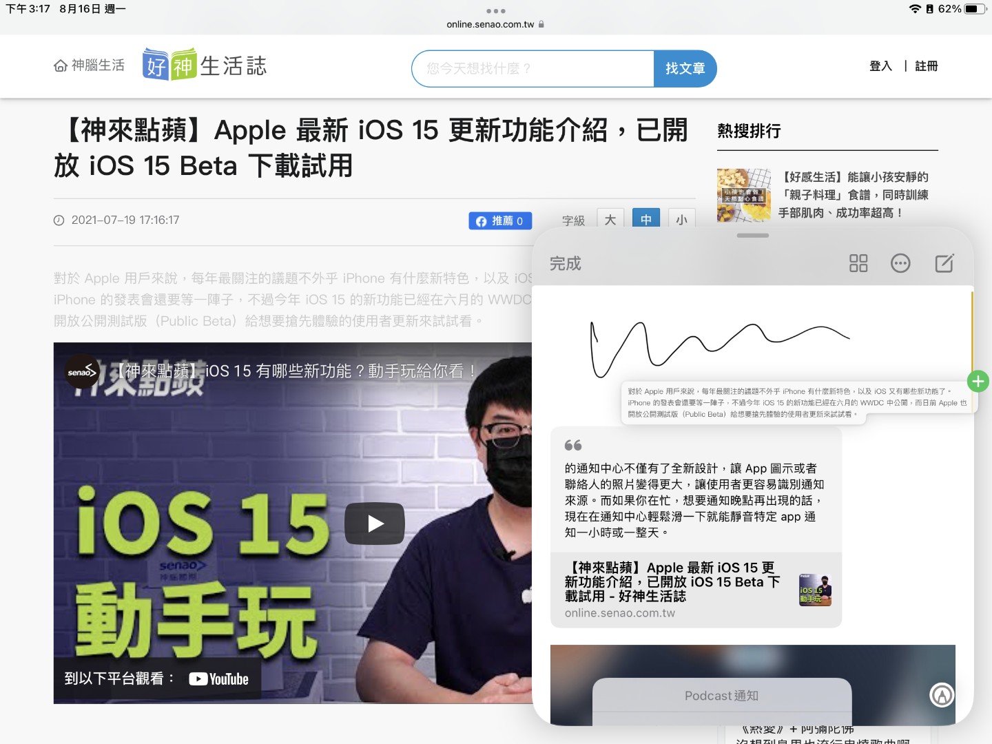 iPad 搭配 Apple Pencil 是十分便利的筆記工具,而有了 iPadOS 15 還能更好用喔!無論你是在逛 FB、滑網頁還是看影片,只要用 Apple Pencil 或是用手指從右下角往上滑一下,就能叫出「快速備忘錄」立即來記錄。