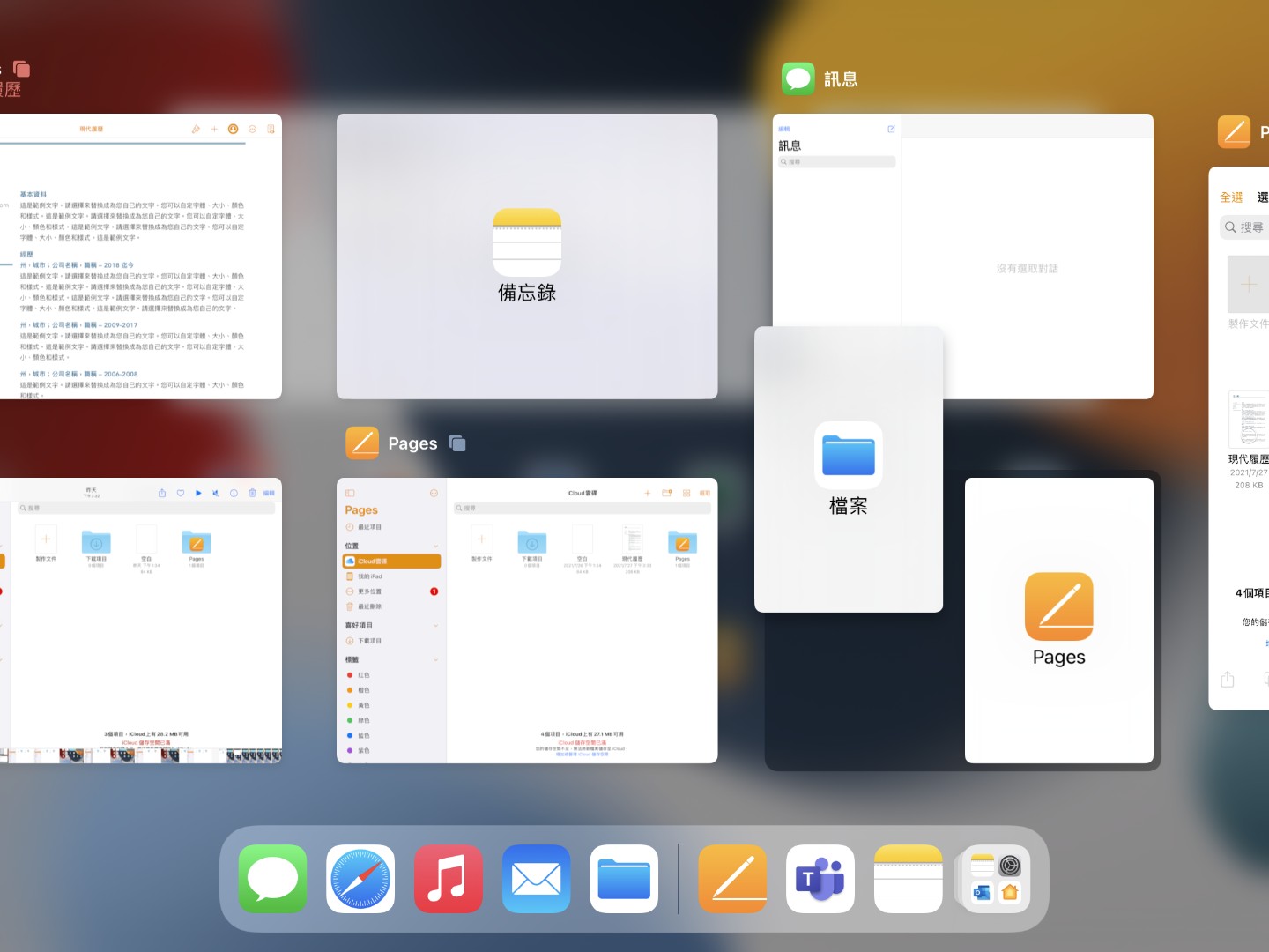 而針對能開啟多個視窗,例如 Pages、Word 等 app,Apple 這次也推出了「陳列架」功能,只要上滑呼叫出 Dock 輕點一下圖示,即可新增或是刪除視窗,讓視窗管理更方便。而這些視窗除了能在「陳列架」中管理,也可在「App 切換器」中一覽無遺。