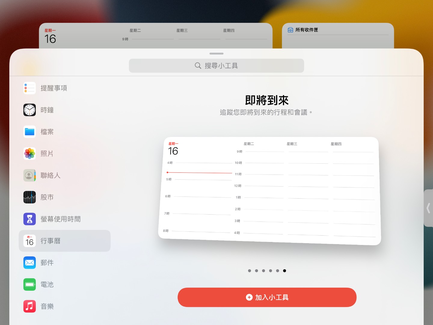 除了能在 iPad 的主畫面上使用小工具之外,Apple 也為了妥善運用 iPad 的大螢幕空間。讓「行事曆」等小工具有了更大的尺寸,往後數小時甚至數日的行程都能一覽無遺。再搭配上 iPadOS 15 也擁有的「專注模式」,自訂好「工作」模式要顯示的主畫面之後,一下就能切換至工作狀態。