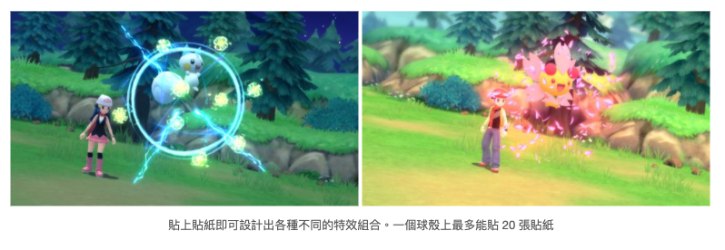 「球殼裝飾」可以讓你用貼紙自行設計寶可夢在對戰和「超級華麗大賽」時,從精靈球裡跳出的特效。貼紙的種類多達 90 種以上,特效包括翩翩飄落的花瓣、熊熊燃燒的火焰等,只要將貼紙貼到球殼上就能輕鬆改變設計。