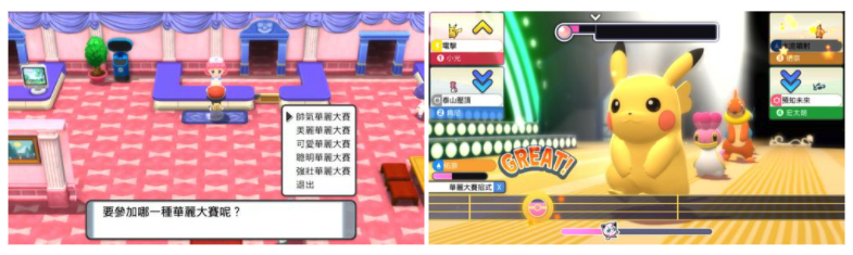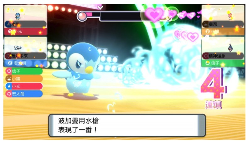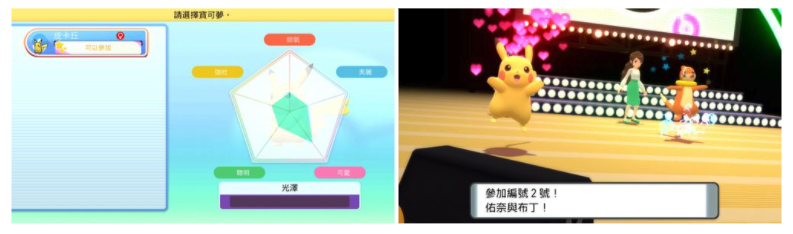 若要讓表演成功,便得在寶可夢的狀態和節奏感等方面得到好評價,表演者之間也得合作,互相配合各自寶可夢使出招式的時機。若使用 Nintendo Switch 的鄰近主機通訊和網路通訊,最多可 4 人一起參加。和同伴們一起展現最棒的表演,讓觀眾看得如癡如狂吧!