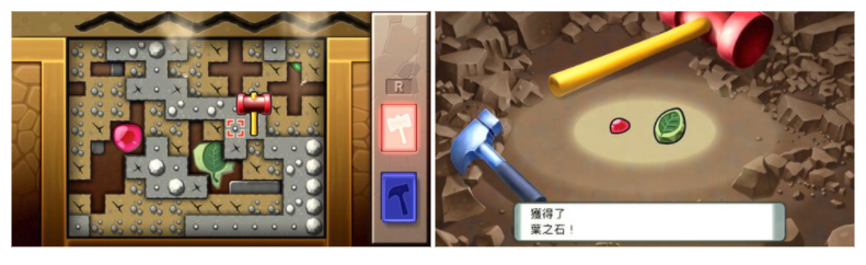 「地下大洞窟」裡有些牆壁可以使用鎬子和鎚子來挖掘。在挖掘的過程中能獲得有助於冒險的道具以及貴重的寶可夢化石,而且,在本作還能新找到「寶可夢的石像」。挖掘出來的道具會在神奧地區的冒險派上用場,復原寶可夢的化石能讓寶可夢成為夥伴,「寶可夢的石像」則能夠作為收藏。牆壁可挖掘的次數有限,過度挖掘將導致牆壁崩塌,所以請謹慎地找出寶物的位置,多多挖掘出寶物吧。