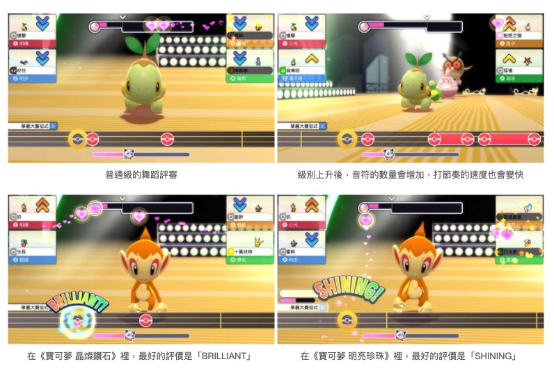 在「視覺評審」之後,要評審的是寶可夢的節奏感。配合隨著音樂流過來的音符準確地打節奏,會得到華麗點數。參加的級別越高,音符的數量越多,挑戰性也隨之提高。「舞蹈評審」是在「超級華麗大賽」中大量獲得華麗點數的重要階段,請反覆挑戰來增進技巧吧!