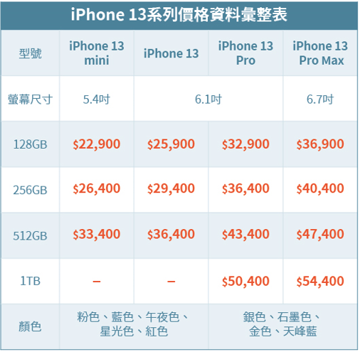 此次 iPhone 13 系列的機型、螢幕尺寸延續前一代,由小到大分別為 5.4 吋的 iPhone 13 mini 、 6.1 吋 iPhone 13 、 6.1 吋 iPhone 13 Pro 以及 6.7 吋 iPhone 13 Pro Max 。