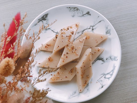 有看過宮廷劇出現的甜品「藕粉丸子」嗎?就是將糯米丸子加入利用「蓮藕粉」勾芡而成湯汁中製成。你也可以試試看下面推薦的這款「桂花蓮藕糕」,外型精緻討喜,軟糯的口感加上桂花的清香,讓人忍不住一口接一口。