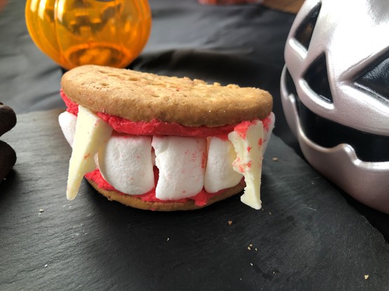 ➡️ STEP 5. 將紅色巧克力塗在兩片切半餅乾上,一片餅乾放上棉花糖排成牙齒,再蓋上另一片餅乾,並加上白巧克力做成的尖牙