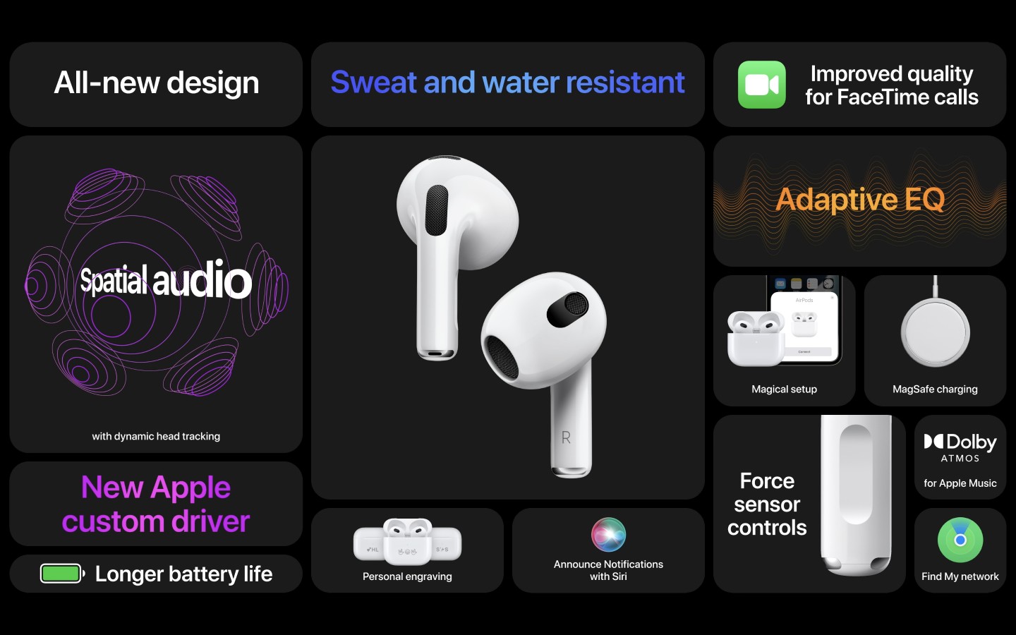 不少人期待已久的新款 AirPods 也在這次的發表會上登場。AirPods(第 3 代)具備抗汗抗水能力,並採用新的輪廓設計,耳機柄較 AirPods(第 2 代)更短,看起來更為時尚有型。AirPods(第 3 代)還擁有「適應性等化」技術,可以根據使用者的耳形依耳機貼合耳朵的情況與內向式麥克風所監測到的聲音,來補足在不同耳機貼合度下所遺失的中、低頻聲音,呈現每首音樂的豐富細節。