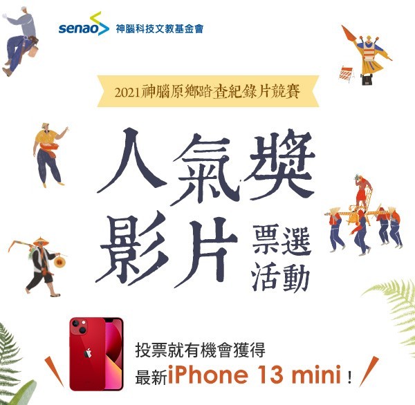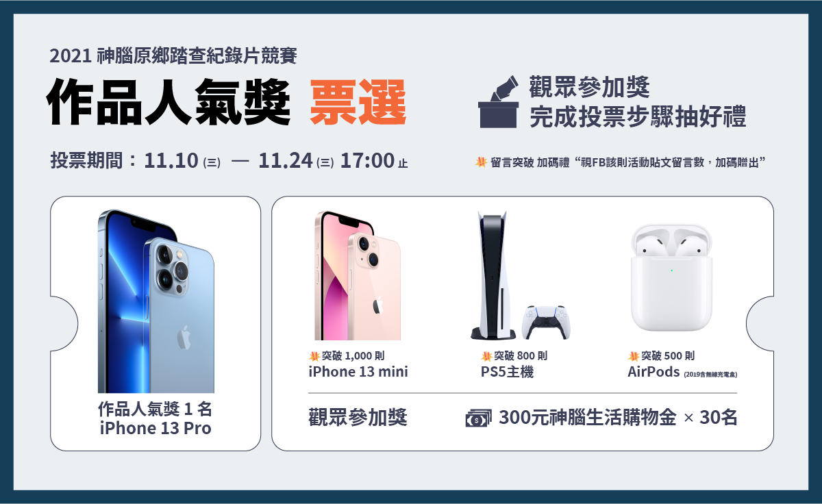 第13屆神腦原鄉踏查紀錄片競賽評審團陣容堅強,包含金馬級導演黃信堯、沈可尚、顏蘭權、黃惠偵及洪淳修導演,五位大咖評審導演耗費一個多月審查,絞盡腦汁評選出以下29組入圍團隊,邀請觀眾一起跟著紀錄片遊歷最在地的台灣。挑選你最喜愛的紀錄片投下神聖的選票,就有機會獲得iPhone 13 mini、PS5主機、AirPods等獎項!