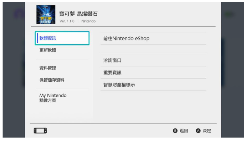 下載更新資料後,軟體的版本將會更新。在 Nintendo Switch 的 HOME 選單裡,將游標移至《寶可夢 晶燦鑽石》或《寶可夢 明亮珍珠》圖示,接著按下「- 鍵」或「+ 鍵」。如畫面所示,遊戲標題的下方會顯示版本資訊。若此處顯示「Ver. 1.1.0」,就代表更新資料已下載完畢。