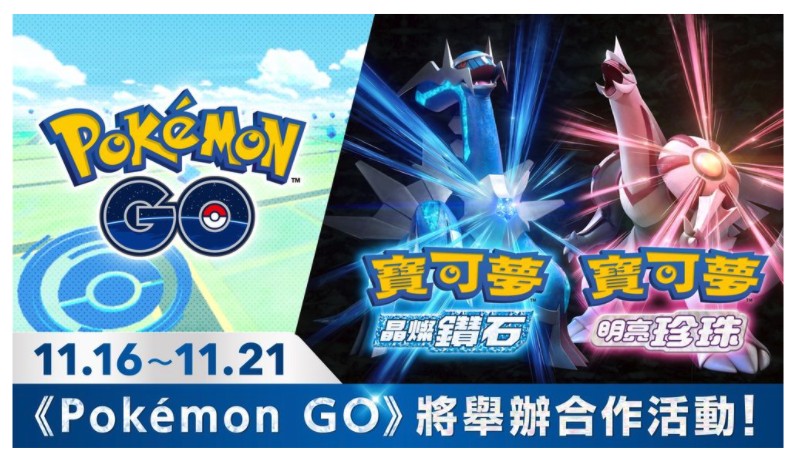 為了紀念 Nintendo Switch 軟體《寶可夢 晶燦鑽石/明亮珍珠》發售,台灣香港時間 2021 年 11 月 16 日 10:00 起到 11 月 21 日 20:00 將舉辦合作活動!在活動期間內,和《寶可夢 晶燦鑽石/明亮珍珠》有關的寶可夢,以及身穿特別服飾的草苗龜、小火焰猴、波加曼將在《Pokemon GO》登場,遊戲內的商店還會上架以《寶可夢 晶燦鑽石/明亮珍珠》主角的服裝為主題的換裝道具。