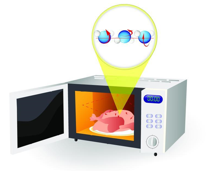微波爐的原理是利用「低頻電磁波」,讓食物中的「水分子」快速震動產生熱能,簡單點想,就像是你快速、不斷地的搓揉雙手會生熱這樣的原理。
