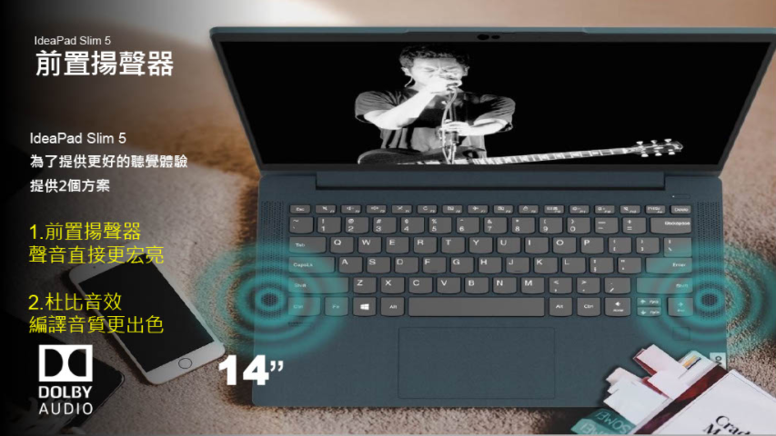 Lenovo Slim 5螢幕採四窄邊框設計,提供高達90%螢幕佔比,帶來更寬廣的視野。重量輕巧僅1.39Kg輕薄好攜帶,支援快充功能只要1小時即可回復80%電力。筆電上蓋使用鋁合金材質設計,搭配獨特防滑塗層讓表面觸感柔軟舒適。處理器採用7奈米AMDRyzen 5六核心處理器,搭配512G SSD高速硬碟,強悍效能無論工作、遠距視訊、影音娛樂皆能滿足。