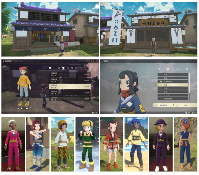 主角可以在祝慶村自由改變服裝和髮型。「衣鋪」是販售衣物的店鋪,這裡的商品五花八門,從基本款的衣服到時髦的洋裝、帽子、面具等一應俱全。搭配在「理髮店」打理出的流行髮型和髮色,就能從頭到腳融入洗翠地區的風格了。挑戰各種不同的組合,打扮出個人特色再出發去調查吧。