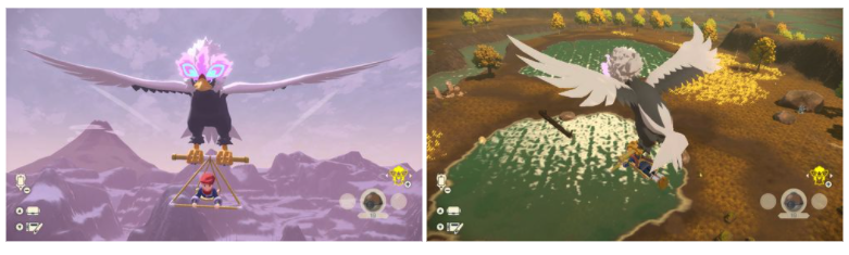 借助勇士雄鷹(洗翠的樣子)的力量就能在空中移動。屆時將能飛越巨大的懸崖,也能從山頂一口氣急降到低處,行動範圍將變得寬廣。另外還能從空中俯瞰大地來收集寶可夢棲息地或掉落的道具等的資訊,藉以挑選下一個要去的地方,對調查來說也是莫大的幫助。在空中欣賞洗翠地區的壯麗景致,自由自在地翱翔吧。