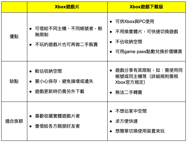 Xbox主機現在分為了有光碟機版本與無光碟機版本的機種,遊戲自然也有分為實體遊戲片及數位版來販賣,但究竟這兩者該如何取捨?以下小編幫你整理了各自的優缺點,讓你可以依照自己的需求及喜好來挑選。