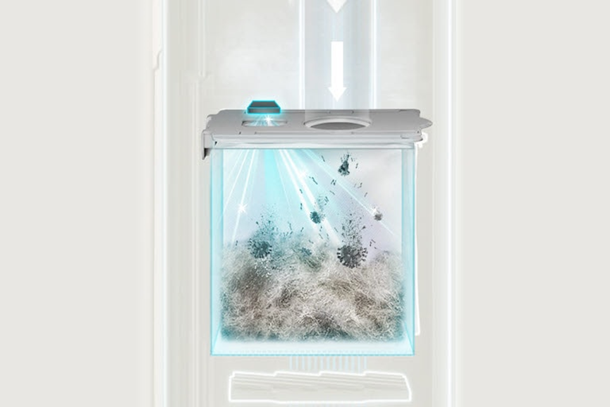 集塵袋上方更有「UVC」紫外線殺菌燈,不必擔心集塵袋中的灰塵滋生細菌或黴菌。