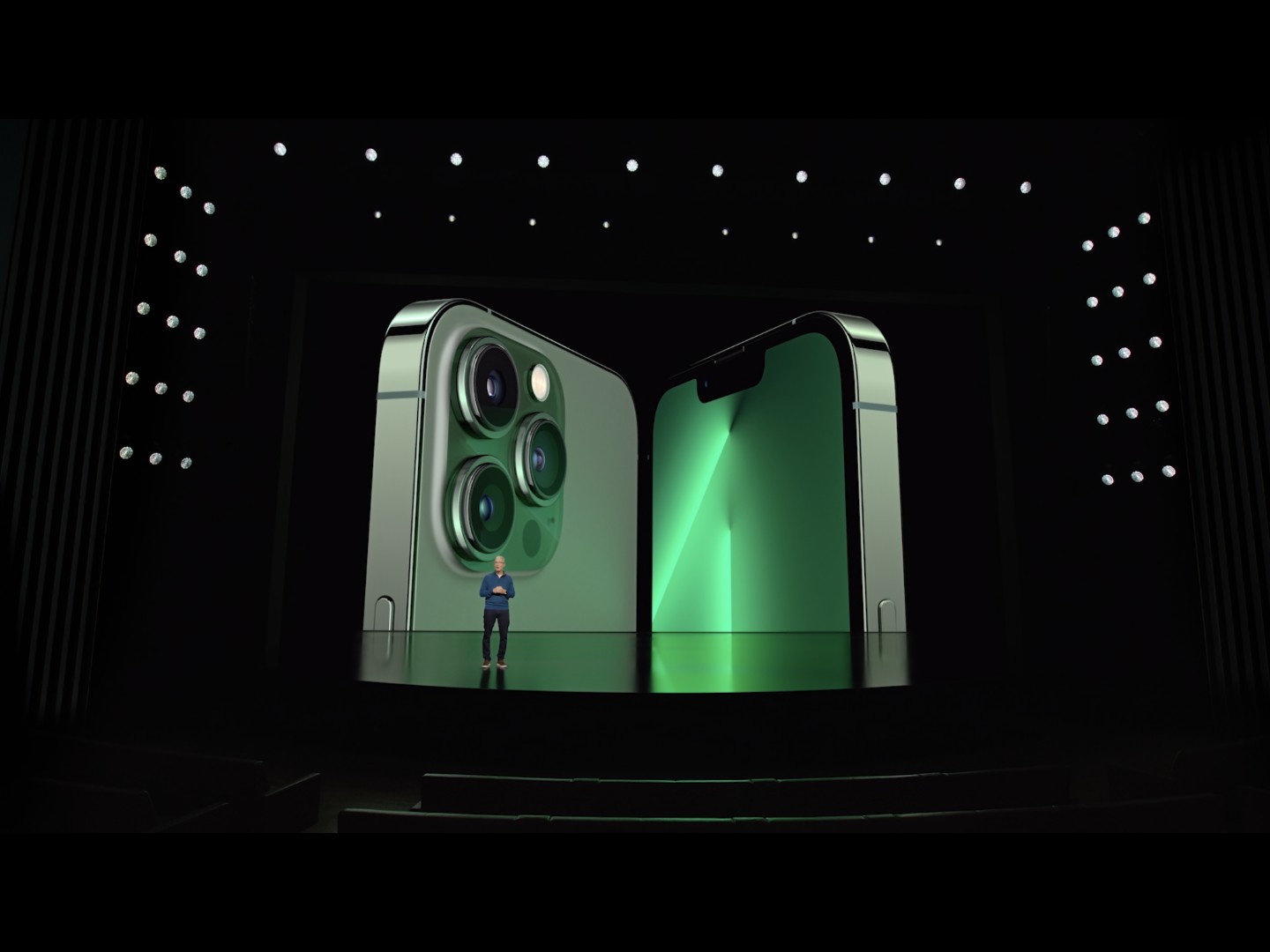在發表會上首先登場的是 iPhone 13 Pro 新顏色「松嶺青」以及「綠色」的 iPhone 13,這兩款新色都將在 3/18 登場。
