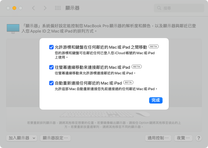接著到左下角的「加入顯示器」將你想要一起使用「通用控制」功能的 iPad 與 Mac 勾選就可以開始體驗「通用控制」神奇的魅力啦!