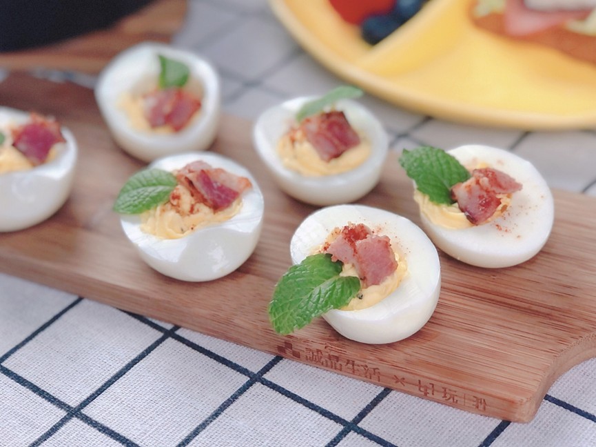 5. 將調好的蛋黃餡料填入蛋白 (也可以用擠花袋,造型會更精緻),放上培根片,並灑上匈牙利紅椒粉,最後可以放上薄荷葉或者香菜葉做為裝飾即完成。