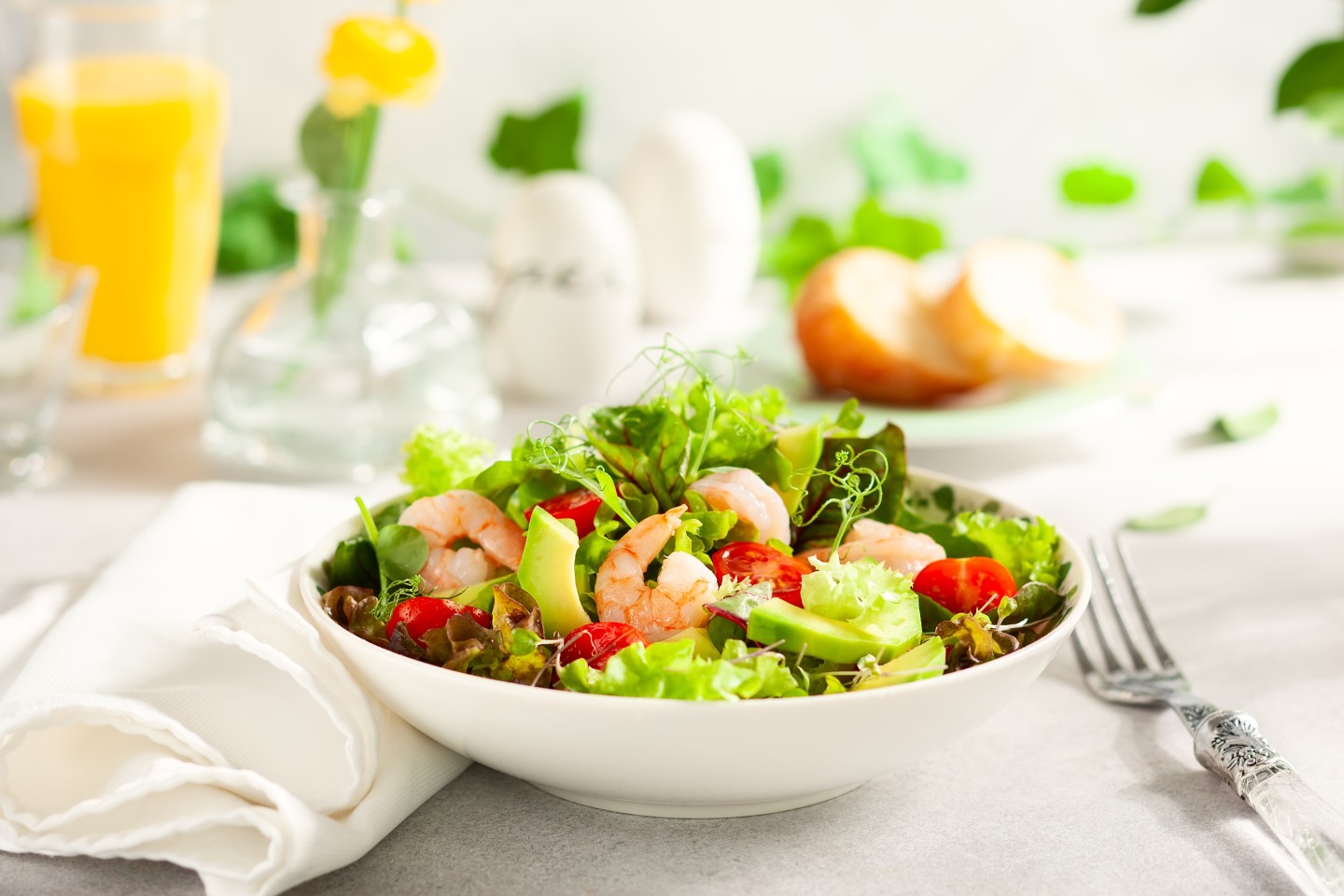 4. 準備萵苣蘿蔓、玉女小番茄、蘋果丁、堅果,加入汆燙好的鮮蝦、花椰菜、玉米筍,淋上以檸檬汁、柳橙汁、橄欖油、鹽、胡椒粉等攪拌均勻而成的醬汁,點綴百里香即完成