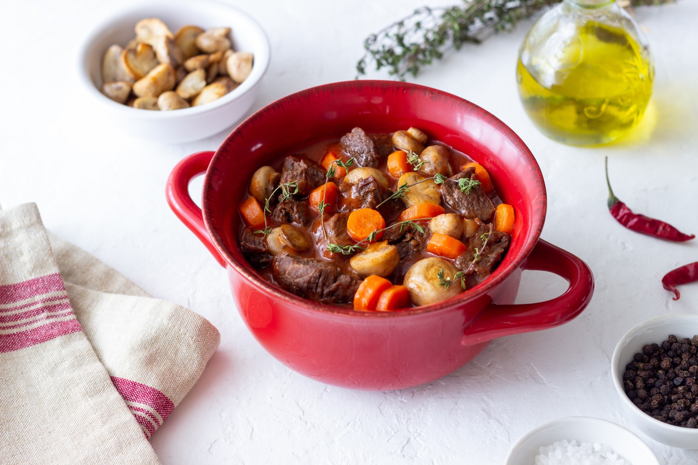 5. 上述材料放入湯鍋內,加入紅酒、高湯、黑胡椒、鹽、義大利麵醬,開小火燉煮1.5至2小時,幸福美味的紅酒燉牛肉就大功告成囉!