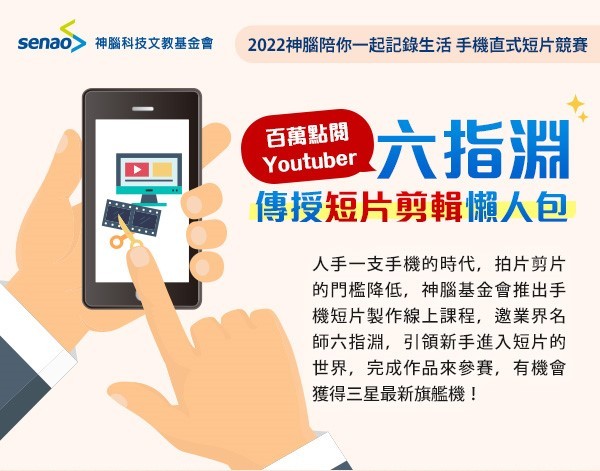 人手一支手機的時代,拍攝影片及剪片的門檻降低,隨手就能記錄生活、發揮創意,神腦基金會順應潮流推出手機短片製作線上課程,邀業界名師六指淵,引領新手朋友進入短影片的世界,完成90秒短片作品來參賽,有機會獲得三星最新旗艦機等好禮!