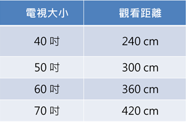 根據這個基準,目前的電視尺寸可適用範圍可參考以下列表: